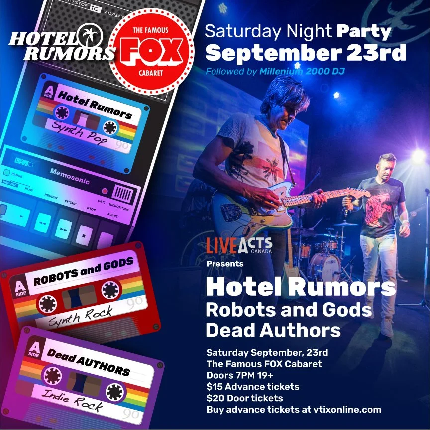 Hotel Rumors is an indie pop band from Vancouver British Columbia Canada formed in 2019 by James Faulkner and Colin Holyk. The two friends spent ten years playing hundreds of gigs with their cover band Line49, and now, as Hotel Rumors, have brought their own musical ideas to life. Their debut album, Riviera, was released in 2019 and was followed by their new singles Gulfstream and Train to ’95 as well as the Riviera Nights remix album in the summer of 2020. Band Members, James Faulkner - Vocals, Colin Holyk - Guitar, Dave Law - Bass, Rob Riley - Synth Rig/Keys, Francois Lucas - Drums.