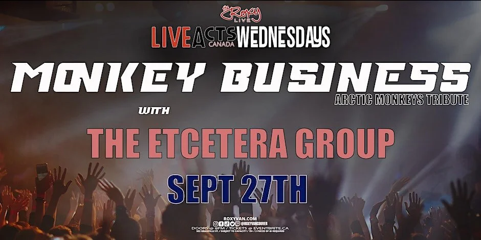 THE ROXY AND LIVE ACTS CANADA PRESENT MONKEY BUSINESS W/ THE ETCETERA GROUP Wed, Sep 27, 2023 DOORS@8PM $12ADV/$15@DOOR +19